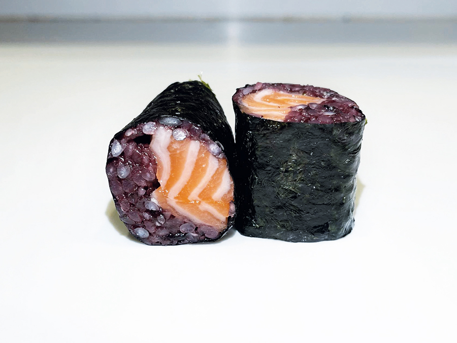 Salmone su riso nero (2 pezzi) Salmon on black rice (2 pieces) Allergeni / Allergens: pesce