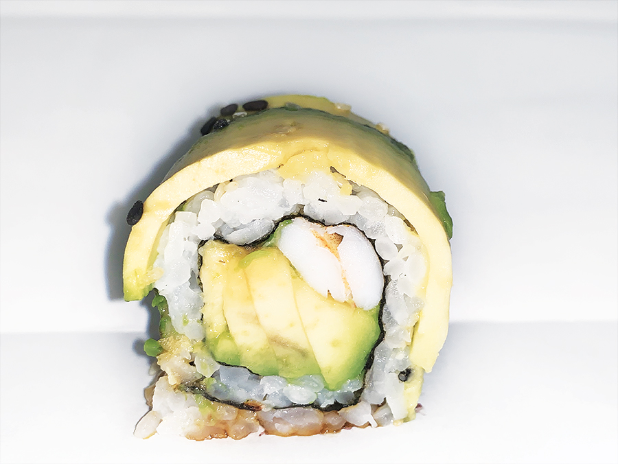 Avocado, gambero crudo, avvolto da gamberi rossi Avocado, raw shrimp, wrapped with shrimp Allergeni / Allergens: crostacei, sesamo