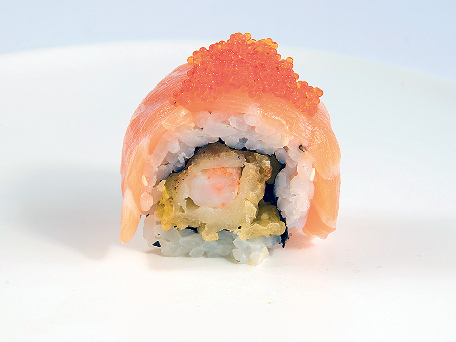 Shrimp* tempura, wrapped with salmon and tobiko, spicy sauce, teriyaki sauce