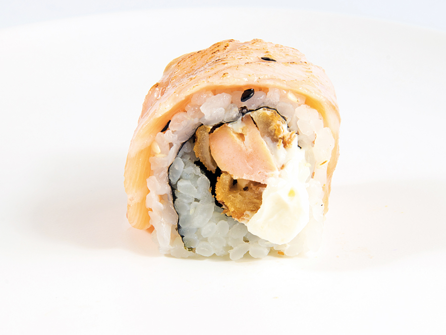 Pollo fritto, philadelphia, avvolto da salmone scottato, spicy maionese