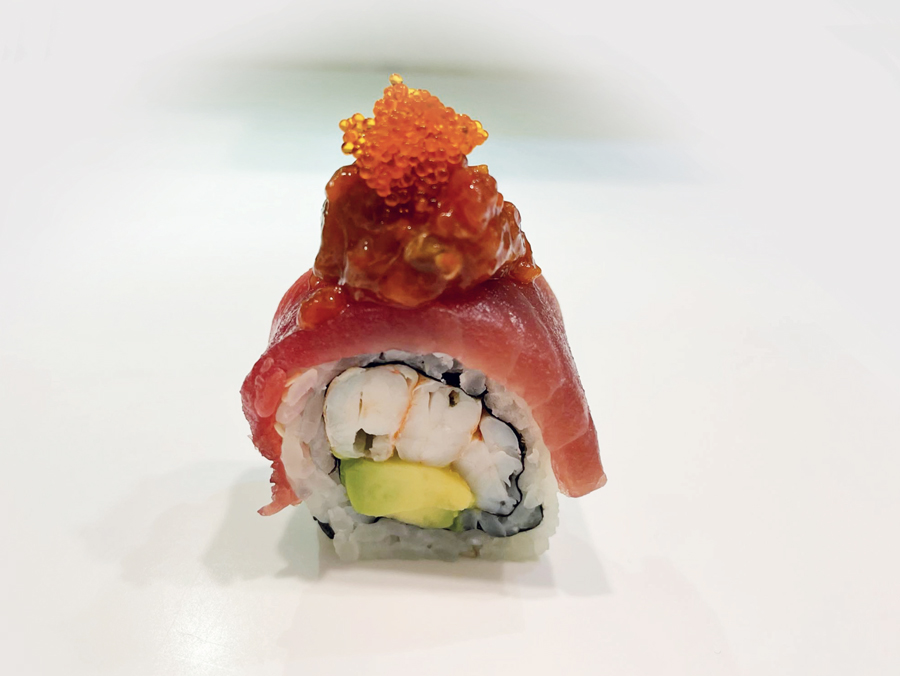Avocado e gambero cotto, avvolto da carpaccio di tonno, tartare di tonno e tobiko